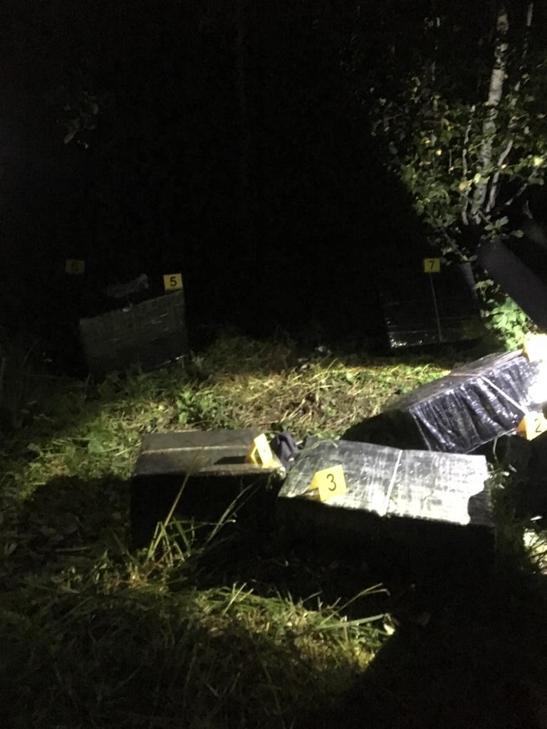 Carrying out state border surveillance, the State Border Guard officials At Alūksnes County, Pededzes parish approximately 1.5 kilometers of the state boar, buy the river Šepica detected four persons which was carrying black bundles with smuggled cigarettes. Seeing the border guards persons started to run a way and disappeared in the forest thicket.