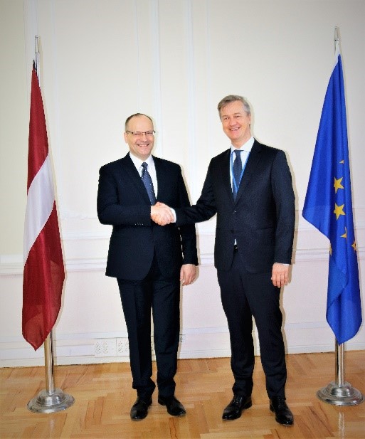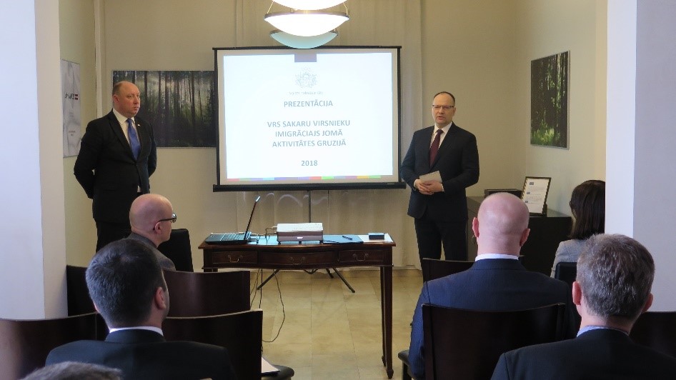 On March 16, 2018 within the framework of the project "Further Development of Liaison Officers Point of the State Border Guard in Georgia and Belarus (1st phase)" Colonel Edmunds Ļuļs, State Border Guard Liaison Officer in Georgia, and Captain Renāts Vecelis, State Border Guard Liaison Officer (expert), held a reporting meeting in the Embassy of the Republic of Latvia in Georgia (Tbilisi) on the activities of the Liaison Officers Point in Georgia in 2017.