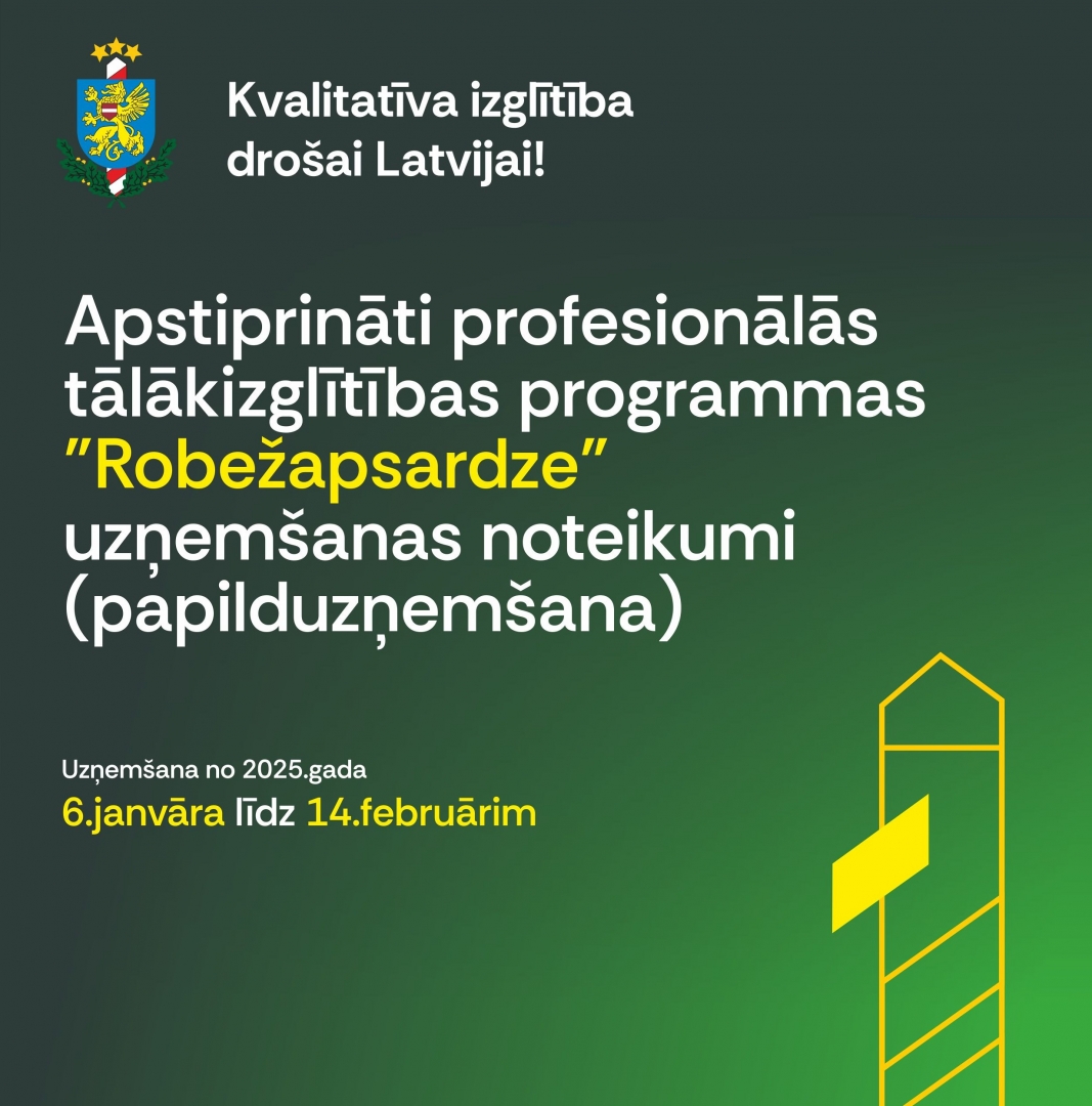 Valsts robežsardzes koledža ir apstiprinājusi uzņemšanas noteikumus profesionālās tālākizglītības programmā „Robežapsardze” 2024./2025. mācību gadam, kuri nosaka, ka par robežsargu var kļūt Latvijas pilsonis ar vidējo izglītību vecumā no 18 līdz 40 gadiem, kurš ar savām personiskajām īpašībām, fizisko sagatavotību un veselības stāvokli piemērots dienestam Valsts robežsardzē.