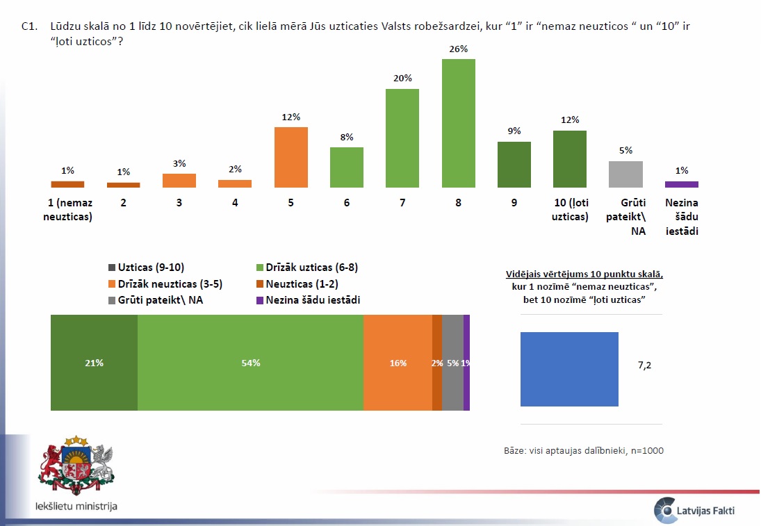Tikai 7% respondentu uzticību Valsts robežsardzei novērtējuši skalā no 1-4, vēl 5% iedzīvotāju nespēja atbildēt uz šo jautājumu, bet 1% aptaujāto nezināja tādu iestādi.
