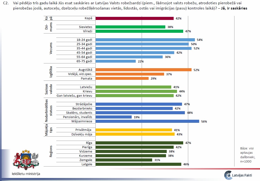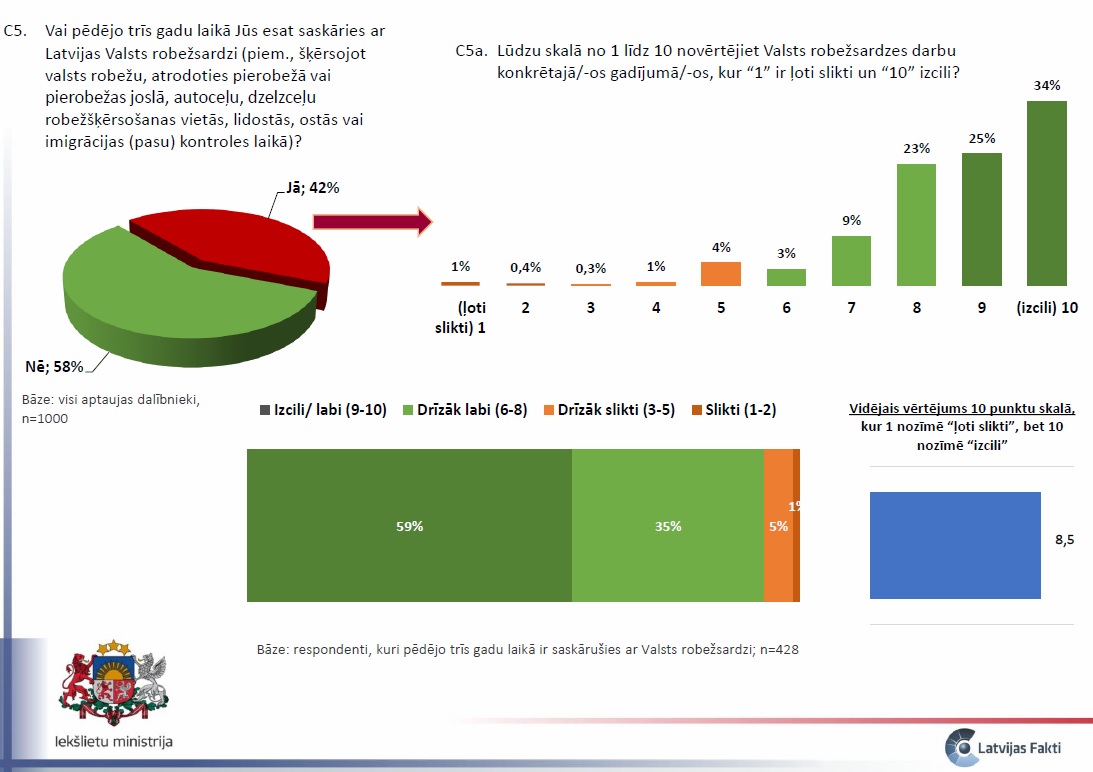 42% aptaujāto Latvijas iedzīvotāju atzinuši, ka pēdējo trīs gadu laikā ir saskārušies ar Valsts robežsardzi un iestādes darbu vidēji novērtējuši ar atzīmi 8,5 (pēc skalas, kur 1 nozīmē “ļoti slikti”, bet 10 nozīmē “izcili”).