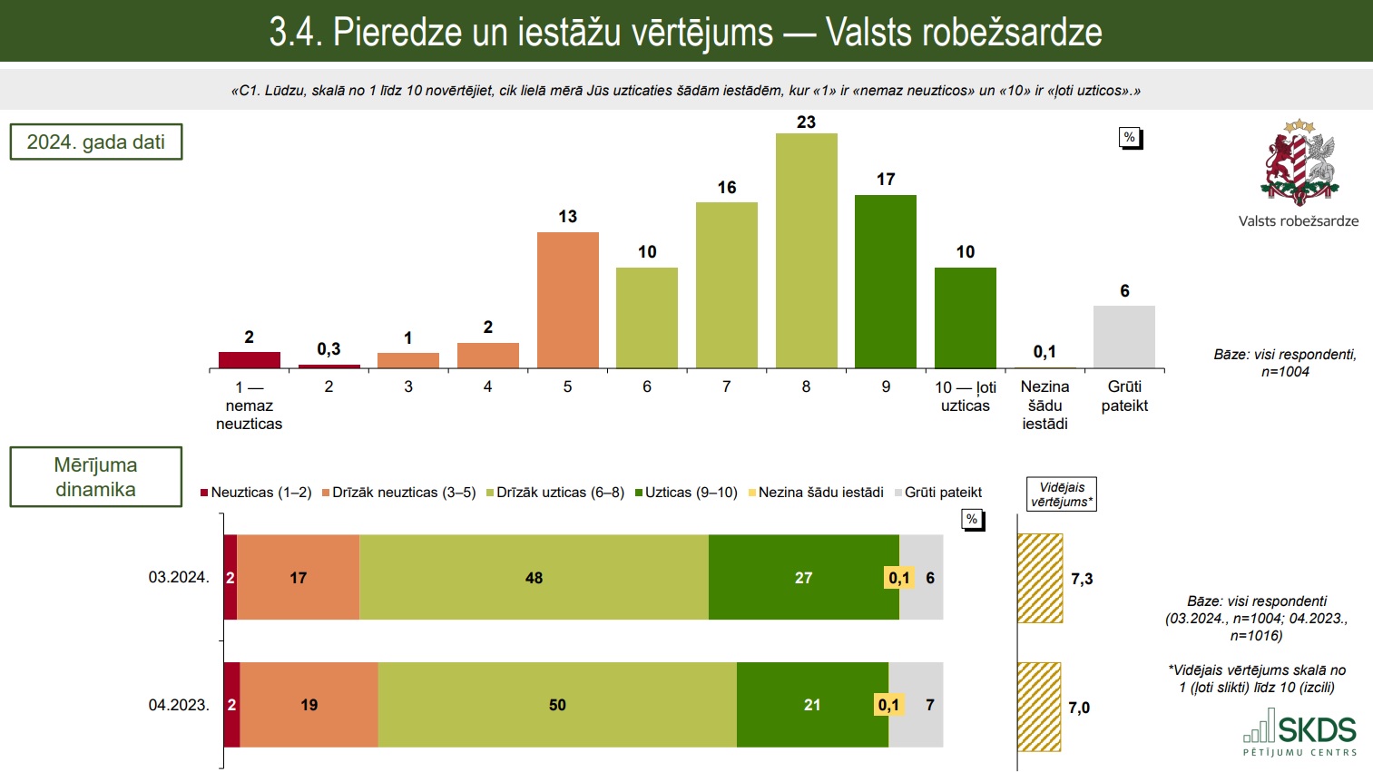 Sabiedrības vidējais uzticības līmenis Valsts robežsardzei ir vērtējams ar atzīmi 7,3, liecina pētījumu centrs SKDS 2024. gada martā veiktā sabiedriskās domas aptauja par drošības jautājumiem. Tas ir par 0,3 procentpunktiem vairāk nekā pērn aprīlī, kad iedzīvotāji uzticības līmeni Valsts robežsardzei novērtēja ar atzīmi 7.