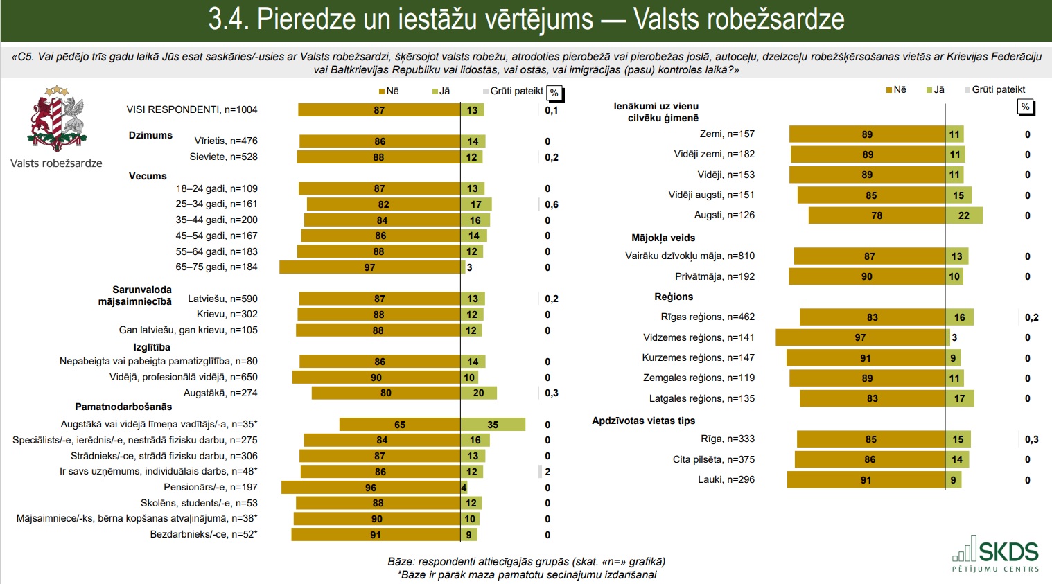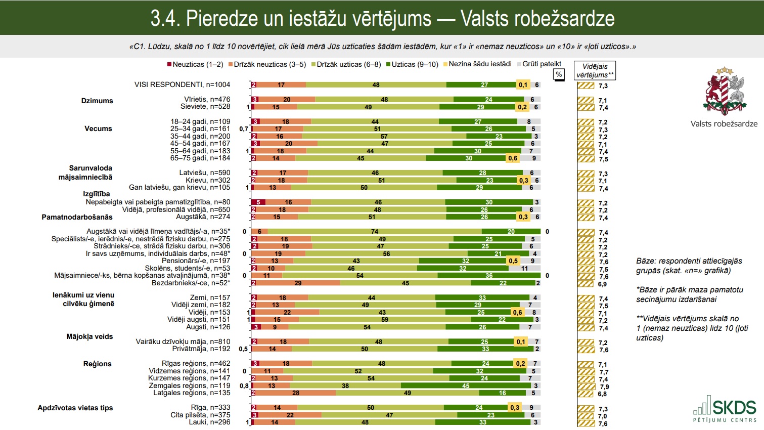Tikai 5% respondentu uzticību Valsts robežsardzei novērtējuši skalā no 1-4, vēl 6% iedzīvotāju nespēja atbildēt uz šo jautājumu.