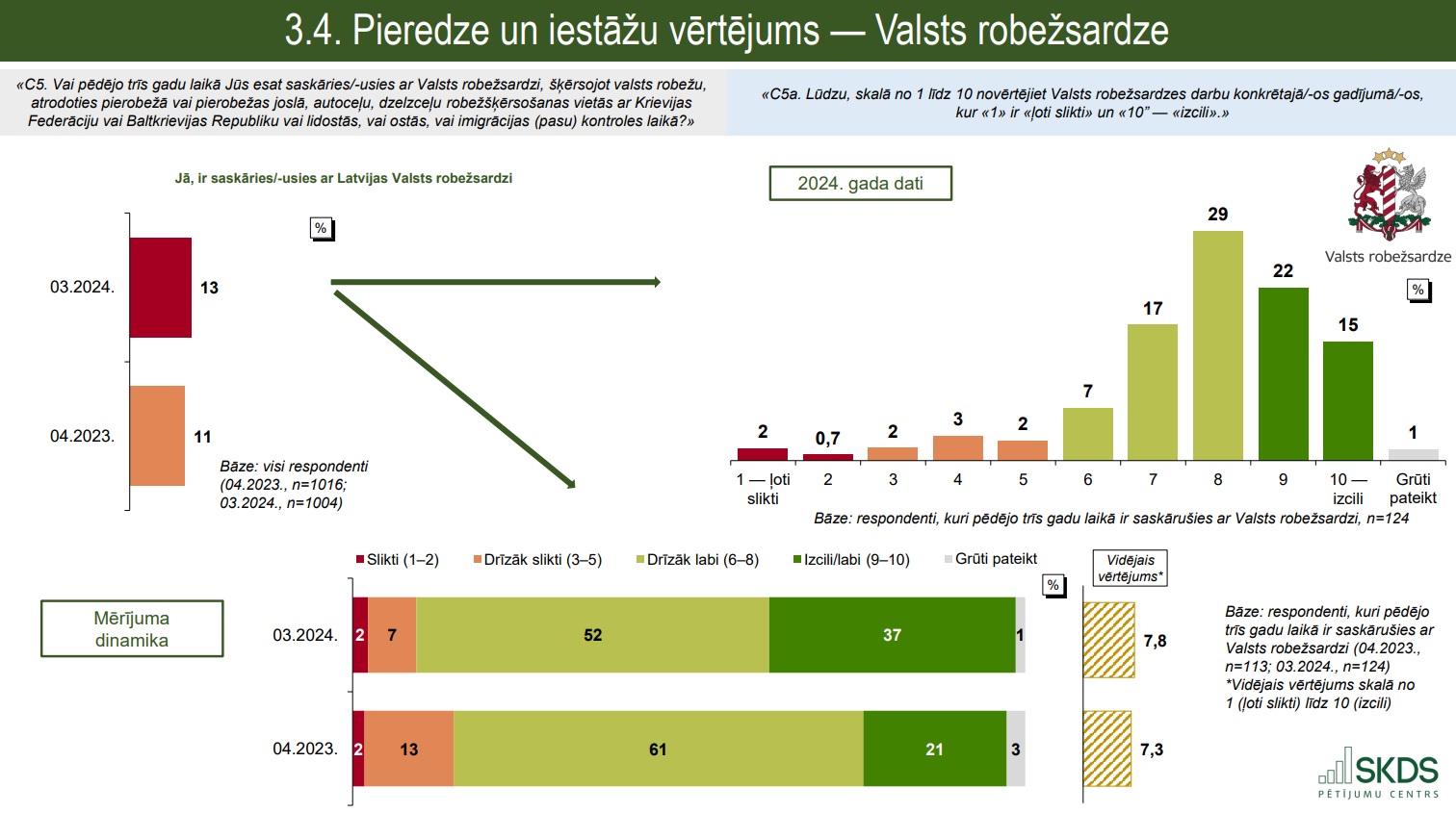 13% aptaujāto Latvijas iedzīvotāju atzinuši, ka pēdējo trīs gadu laikā ir saskārušies ar Valsts robežsardzi un iestādes darbu vidēji novērtējuši ar atzīmi 7,8 (pēc skalas, kur 1 nozīmē “ļoti slikti”, bet 10 nozīmē “izcili”). Šis rādītājs ir uzlabojies par 0,5 procentpunktiem, salīdzinot ar pērn veikto aptauju, kur iedzīvotāji, kuri pēdējo trīs gadu laikā saskārušies ar Valsts robežsardzi, tās darbu novērtēja ar 7,3.