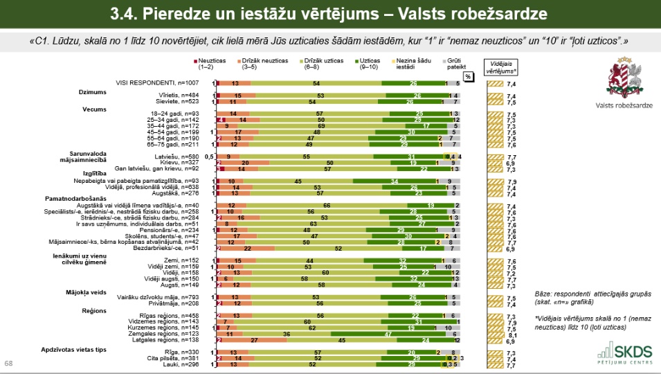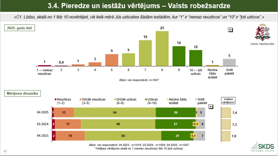 Sabiedrības vidējais uzticības līmenis Valsts robežsardzei ir vērtējams ar atzīmi 7,4, liecina pētījumu centrs SKDS 2025. gada martā un aprīlī veiktā sabiedriskās domas aptauja par drošības jautājumiem. Tas ir par 0,1 procentpunktu vairāk nekā pērn aprīlī, kad iedzīvotāji uzticības līmeni Valsts robežsardzei novērtēja ar atzīmi 7,3, un par 0,4 procentpunktiem vairāk nekā 2023. gadā, kad uzticības līmenis bija 7.