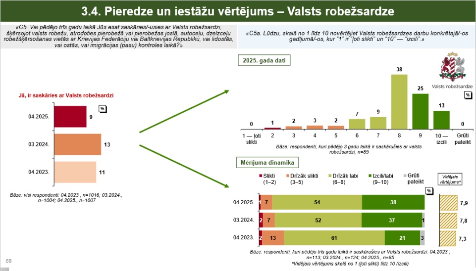 9% aptaujāto Latvijas iedzīvotāju atzinuši, ka pēdējo trīs gadu laikā ir saskārušies ar Valsts robežsardzi un iestādes darbu vidēji novērtējuši ar atzīmi 7,9 (pēc skalas, kur 1 nozīmē “ļoti slikti”, bet 10 nozīmē “izcili”). Šis rādītājs ir uzlabojies par 0,1 procentpunktiem, salīdzinot ar pērn veikto aptauju, kur iedzīvotāji, kuri pēdējo trīs gadu laikā saskārušies ar Valsts robežsardzi, tās darbu novērtēja ar 7,8, kā arī vērtējums ir audzis par 0,6 procentpunktiem, ja to salīdzina ar 2023. gadu, kad iestādes darbs tika novērtēts ar 7,3.