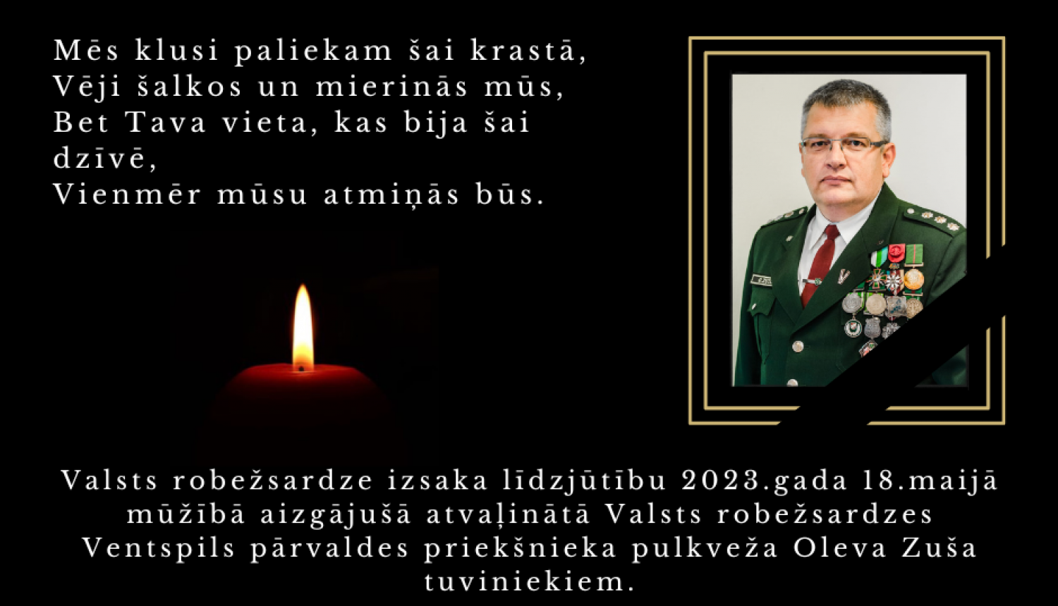 2023. gada 18.maijā pēc cīņas ar smagu slimību, mūžībā devās Valsts robežsardzes pulkvedis, Viestura ordeņa virsnieks pulkvedis OLEVS ZUTIS.