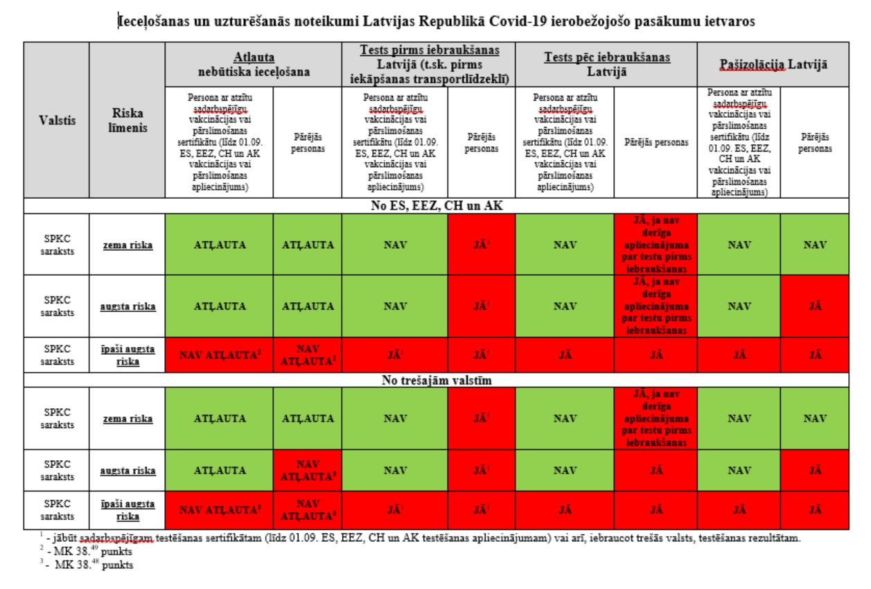 Vakcinētām un pārslimojošām personām nebūtiska ceļojuma aizliegums uz Latviju, prasība veikt testu pirms un pēc ceļojuma, kā arī pašizolācijas prasība saglabājas, tikai ceļojot no valstīm, kurās ir īpaši augsts risks sabiedrības veselībai (“Emergency brake” regulējums).