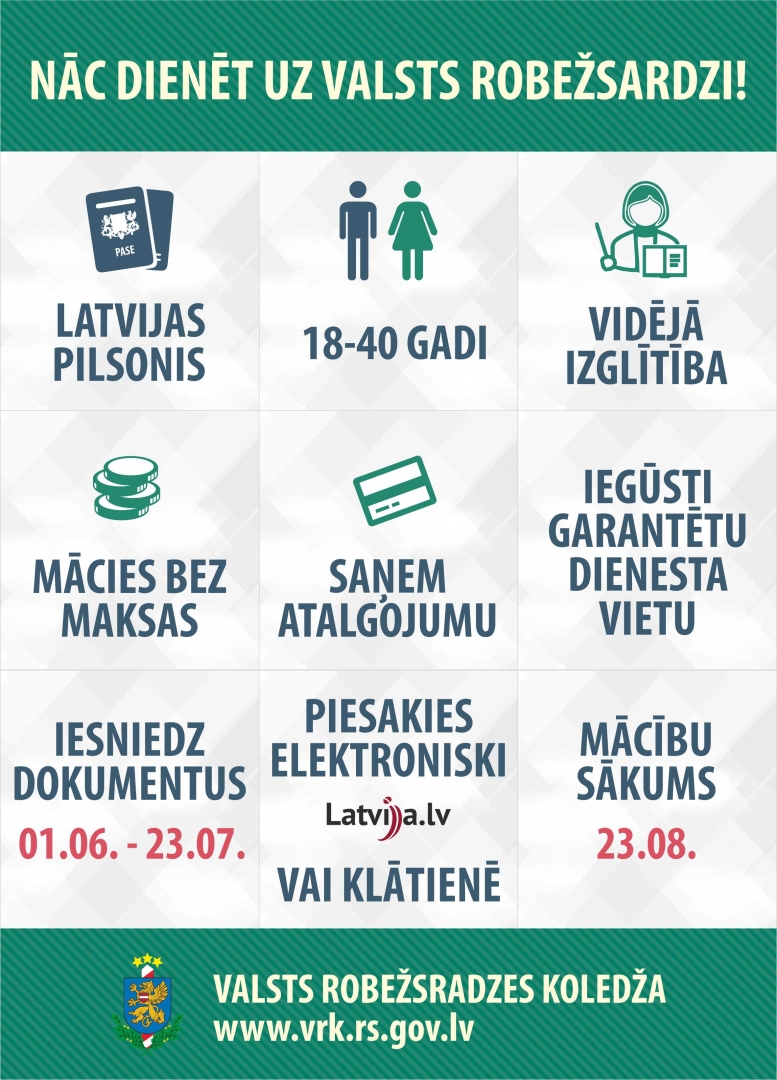 No š.g. 1.jūnija līdz 23.jūlijam Latvijas pilsoņiem ar vidējo izglītību vecumā no 18 līdz 40 gadiem ir iespēja pieteikties mācībām Valsts robežsardzes koledžā profesionālās tālākizglītības programmā „Robežapsardze”.