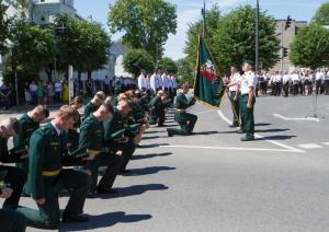 Absolventi svinīgi atvadījās no VRK karoga, nolika ziedus pie pieminekļa „Vienoti Latvijai" un maršā nosoļoja gar pieminekli.