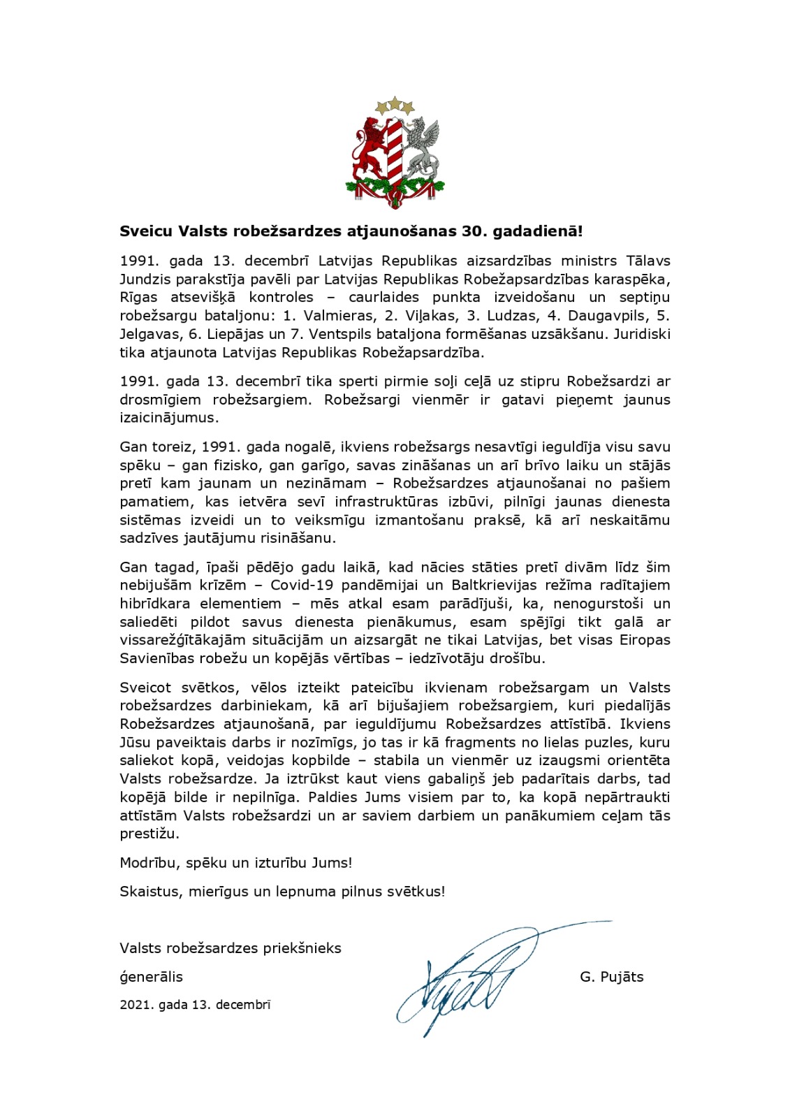 VRS priekšnieka apsveikums Valsts robežsardzes atjaunošanas 30. gadadienā