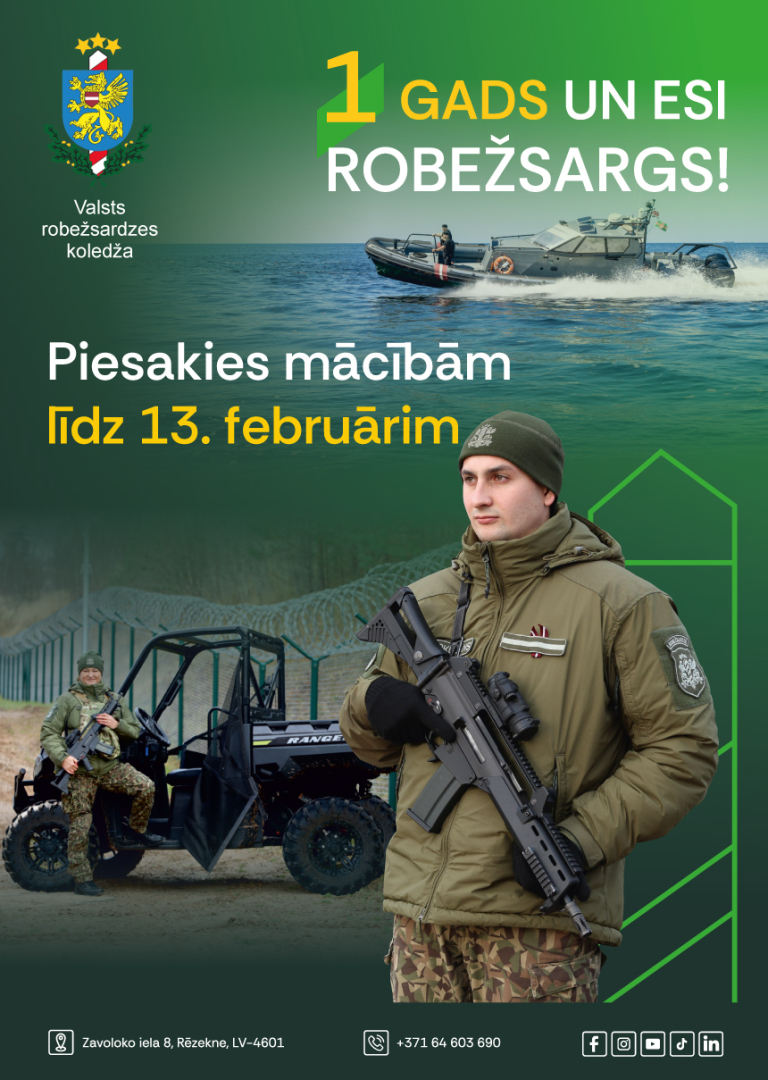Valsts robežsardzes koledža uzsāk papilduzņemšanu profesionālās tālākizglītības programmā “Robežapsardze”. No 2026. gada 5. janvāra līdz 13. februārim Latvijas pilsoņi vecumā no 18 līdz 40 gadiem ar vidējo izglītību ir aicināti pieteikties mācībām, kas nodrošina iespēju sākt dienestu Valsts robežsardzē un veidot karjeru valsts drošības jomā.